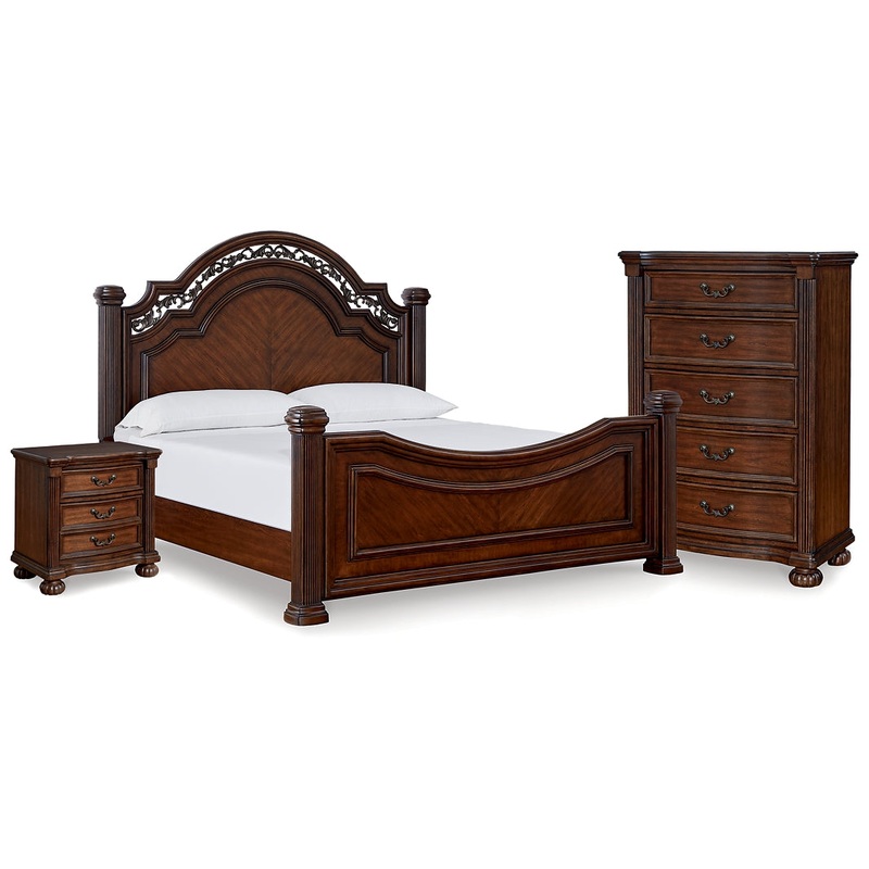 Take inspiration from the traditional luxury of this queen poster bed. Classic with a rich cherry brown finish, its stately presence graces your room with an air of opulence. Your taste for exquisite details is satisfied with the headboards ornate accent filigree. With an elegantly crafted footboard completing the look, your restful retreat has never been so refined. Matching chest and nightstand included.