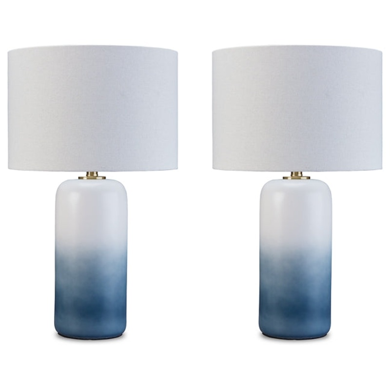 A dramatic ombre design defines this table lamp set. Crafted of ceramic, the lamps feature broad, saturated bands of color that gradually fade to white toward the top. A natural fabric shade extends the tonal gradation and provides a tailored finishing tou