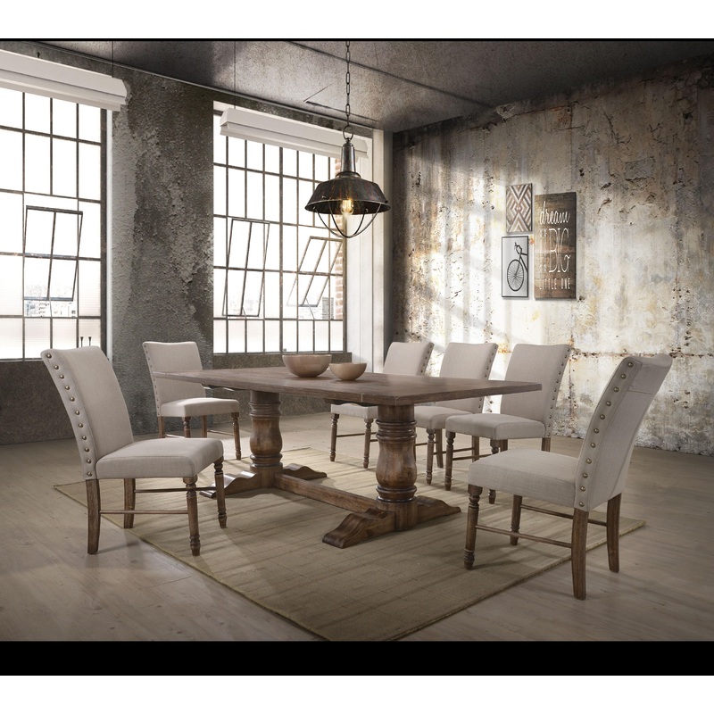 ACME Leventis Dining Table, Weathered Oak (1Set/2Ctn), 40″W x 88″L, 159lbs. Offering elegant and contemporary atmosphere, this Leventis dining set will be a bright focal point in your dining room. The table features double pedestal with trestle base & the armless chair with padded seat and back cushion. This will be an ideal piece for your dining room. Features: – Rectangular Trestle Table with Double Pedestal – Armless Parson Chair – Padded Seat & Back: Cream Fabric Cushion – Nailhead Trim – Wooden Turned Leg: Front Legs Materials: Wood