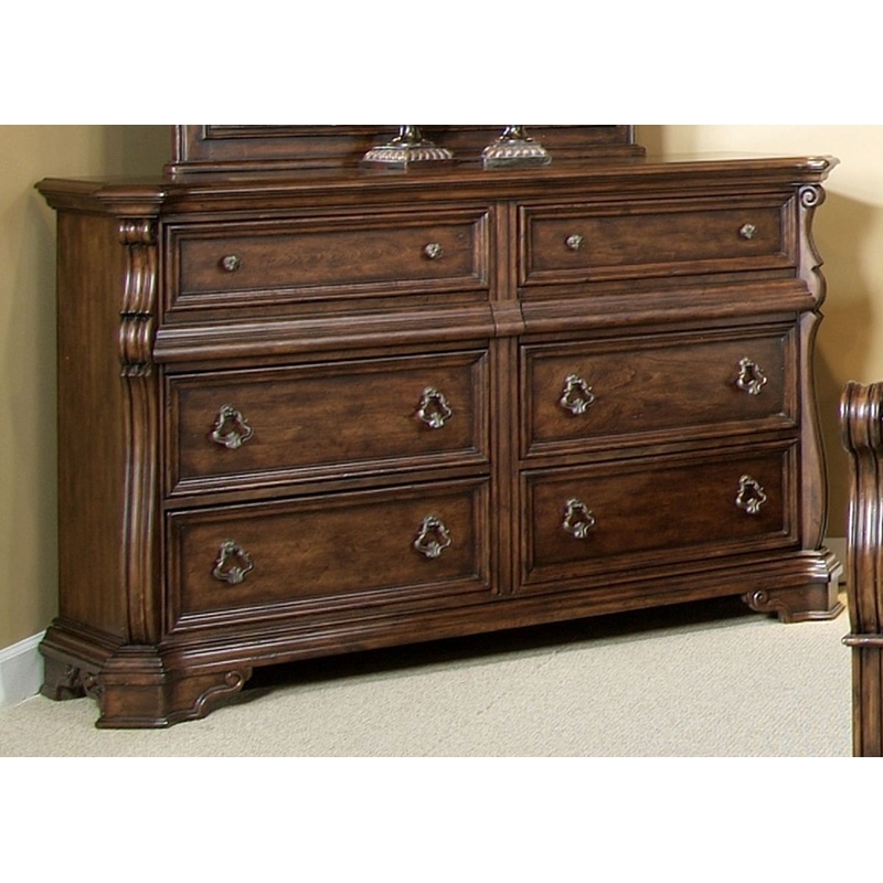Liberty Furniture Arbor Place Double Dresser 575-BR31. Dimensions: W68 x D19 x H40. The Arbor Place Bedroom Collection by Liberty Furniture will draw attention instantly. The superb group is made of Poplar Solids & Birch Veneers in Brownstone Finish. The gorgeous sleigh bed features amazing Burnished Brass Scrolled Metal Inserts that are carried over to the matching landscape mirror. The case pieces show Canted Corner Accents, Fancy Face 4 Way Match Veneer Tops, Shaped Pilasters, Scrolled Bracket Feet, Rope Twist Mouldings, as well as Step Moulding which adds dimension. English Dovetailed Drawers are provided with Burnished Brass Drop Ring and Knob Hardware. Create the ambiance you always wanted in your master bedroom with this eye-catching collection!