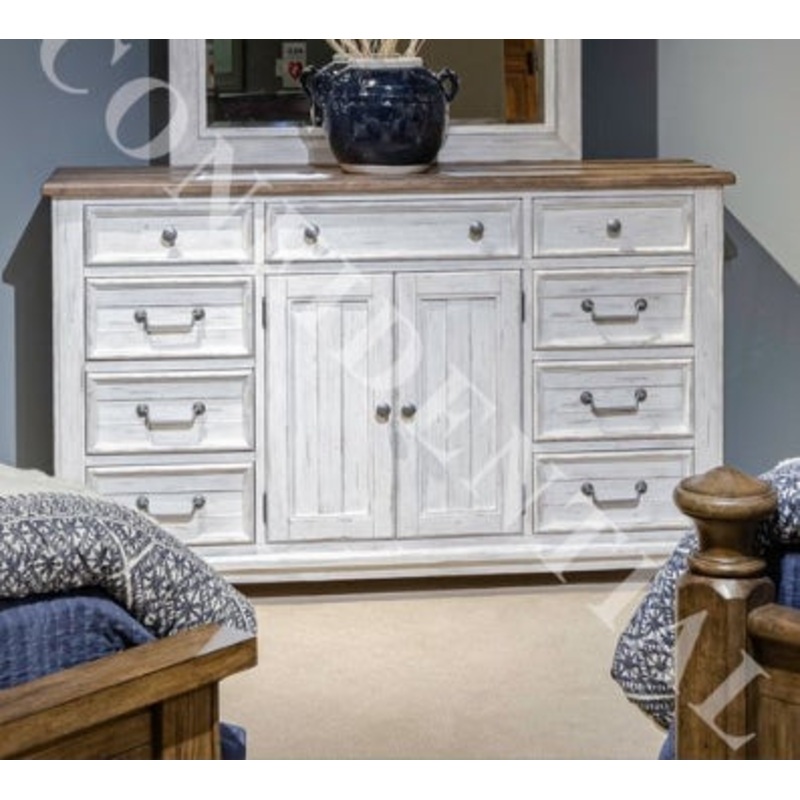 Liberty Furniture River Place 9 Drawer Dresser in Riverstone White and Tobacco 237-BR31. Create a room of your own that provides the perfect start and end to every day with the River Place 2 door 9 drawer dresser. Crafted with excellence using Pine solids and Veneers, this dresser features a heavily distressed two-tone Riverstone White and Tobacco top finish. The wood framed drawer and door fronts, along with the framed end panels and top, feature a high-low veneer pattern for textural interest. The drawers feature full extension soft closing drawer guides for an elegant touch with the top drawers offering premium felt lining to protect your valuables, and the bottom drawers with a beautiful cedar panel. One adjustable shelf is located behind the two doors. Wide pilasters flow into angled block feet to complete the farmhouse styling with a timeworn feel that we all know and love. The custom Antique Pewter bail pull and knob hardware accent the River Place 2 door 9 drawer dresser to help create an inviting, airy atmosphere in your home while providing comfort in your own private getaway.