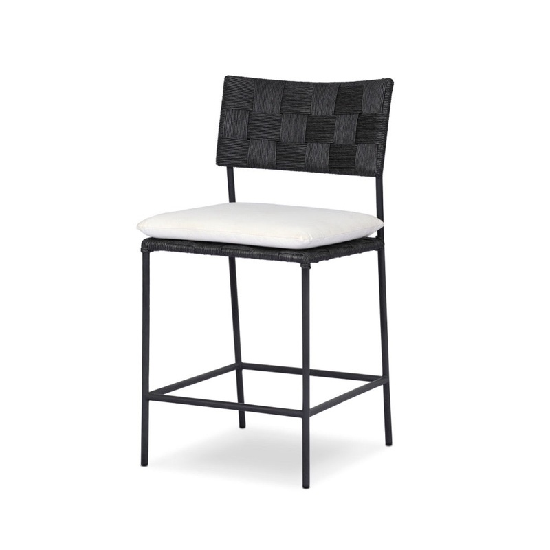 Classic shaping, updated materials and color contrast meet. A monochromatic chunky box weave on the seat and back balance the white cushion of this outdoor counter stool. Cover or store indoors when not in use or during inclement weather.