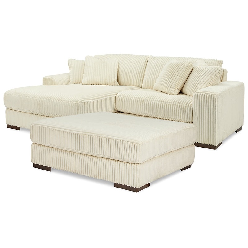 Plush and posh. Showcase your eye for on-trend texture with the statement-making cord upholstery of this sectional and ottoman package. Its stunningly soft fabric entices in an ivory hue, complementing contemporary color palettes. Sink into the cushions and plan to stay a whilethis cozy living room seating set highlights your high-end approach to comfort and style.