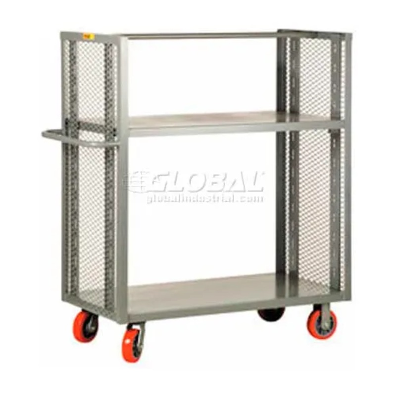 Expanded metal ends extend 48" high above the deck, improve visibility and allow 2-way access to material. All-welded construction with 12 gauge steel shelves. Standard truck has one upper shelf that is adjustable on 3-1/2" centers, and can be positioned w
