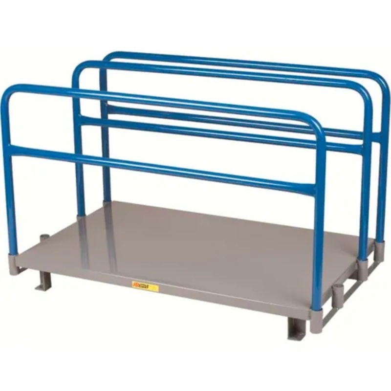 For stationary storage of panels and sheet material. Smooth 12 gauge steel deck has 4″ underclearance. Supplied with 3 upright dividers that extend 27″ above the deck. Legs have foot pads with anchor holes.