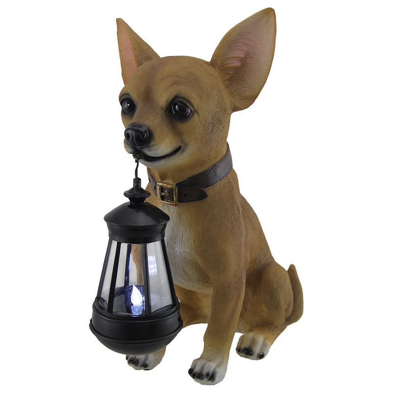 Meet your new loyal companion, this adorable Chihuahua statue, a delightful addition to your outdoor decor. This charming figurine exudes obedience and charm, faithfully stationed near your entryway, deck, or porch stairs. Holding a battery-powered single LED lantern, it illuminates your path, providing a warm and glowing welcome to your guests. Crafted from durable cast resin, this statue stands at a height of 12 1/2 inches, with dimensions of 9 inches in length and 6 inches in width. Its compact size makes it a versatile embellishment for porches and patios, adding a touch of fun and functionality to your outdoor space. Perfect for animal lovers, this statue not only enhances your garden or yard but also serves as a memorial to the loyalty and companionship of our four-legged friends. This resin Chihuahua figurine is not just a decorative piece but a symbol of unwavering loyalty, making it an ideal choice for creating a heartwarming atmosphere in your outdoor sanctuary. With its LED lantern, this statue not only brightens your path but also illuminates your heart with its endearing presence.