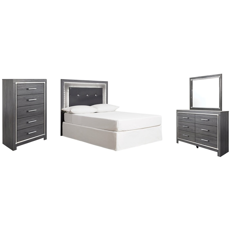 | Details | B214-46: Made of engineered wood (MDF/particleboard) and decorative laminate, Gray finish with replicated wood grain, Faceted chrome-tone pulls and accents, 5 smooth-operating drawers, Drawer interiors are lined with a faux linen laminate for a clean, finished look, Safety is a top priority, clothing storage units are designed to meet the most current standard for stability, ASTM F 2057 (ASTM International), Drawers extend out to accommodate maximum access to drawer interior while maintaining safety, B214-87: Made of engineered wood (MDF/particleboard) and decorative laminate, Gray finish with replicated wood grain, Faux leather upholstery, Faux crystal and faceted chrome-tone metal accents, Accent LED lights with remote to control color and brightness, Included remote holder keeps remote for lights discreet and accessible, Hardware not included, ” bolts are needed to attach headboard to existing metal bed frame, Capable of attaching to a full sized metal bolt-on bedframe, Power cord included; UL Listed, Mattress and foundation/box spring available, sold separately, Assembly required, B214B1: Made of engineered wood (MDF/particleboard) and decorative laminate, Gray finish with replicated wood grain, Faceted chrome-tone pulls and accents, 6 smooth-operating drawers, Drawers lined with faux linen laminate, Mirror attaches to back of dresser, Includes tipover restraint device, Assembly required, |