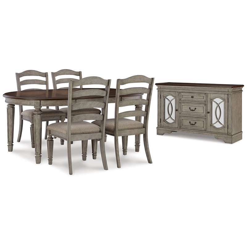 This dining package adds understated beauty to any dining space with its traditional cottage design. Its outstanding two-tone finish features an antiqued gray body with a rich deep walnut brown top. The classic farmhouse ladderback chair gets a fresh makeover in this dining set perfect for school night dinners and full-on family feasts alike.