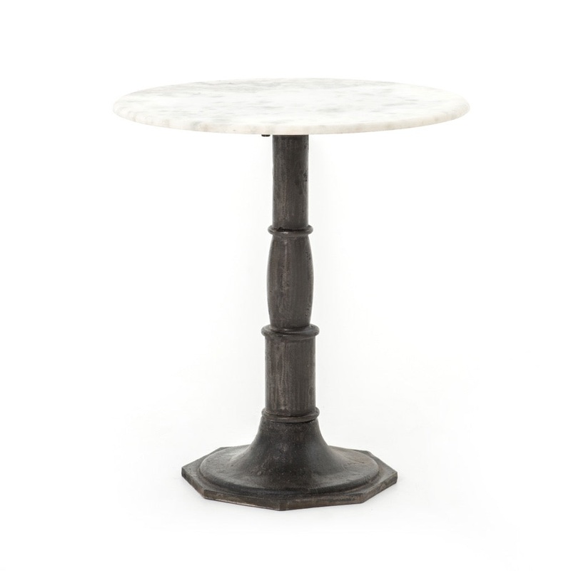 French-industrial meets bistro table. Detailed, 8-sided cast iron pedestal supports a dramatic white marble top with bull-nosed edge.