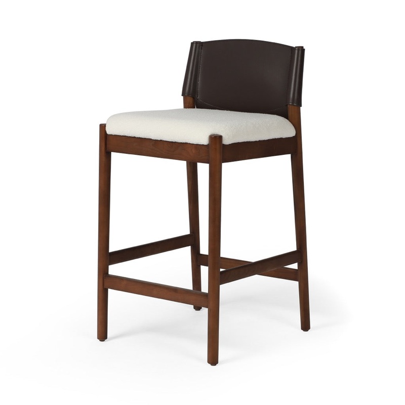 Sleek, streamlined seating with a midcentury vibe. Armless counter stool features a dark leather-blend sling seatback and a faux shearling seat in liquid-repellent performance fabric. Subtly curved arms, frame and legs made of solid ash wood. Performance fabrics are specially created to withstand spills, stains, high traffic and wear, ensuring long-term comfort and unmatched durability.