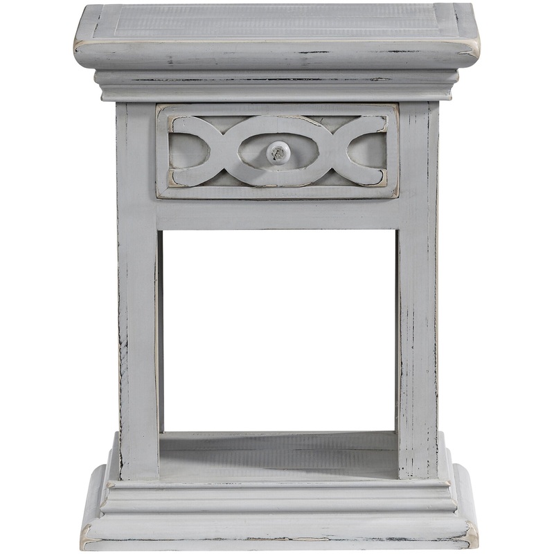 Try this little beauty in your bedroom to kick up your bedroom suit a notch. A simple design with a pretty little circular detail molding on the drawer front. Not to mention in the most gorgeous “Antique Turquoise” finish that is even more stunning in person. One finished drawer and an open shelf for storage or display. This design and finish will work with so many different styles. – Product Details provided by Manufacturer, Slumberland not responsible for errors in information.
