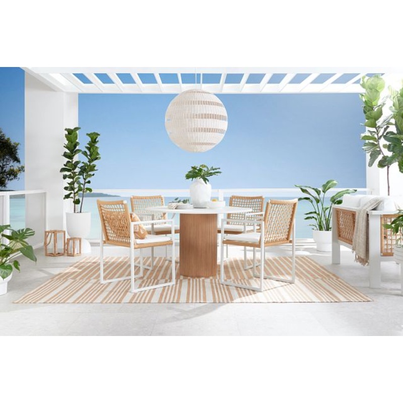 Lynden Light Tone Round Table & 4 White Woven Upholstered Side Chairs