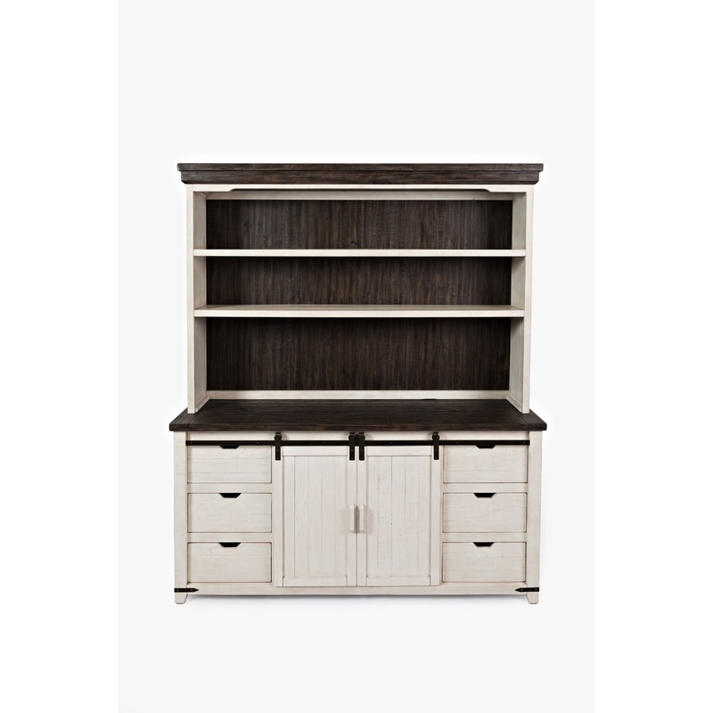 Expertly crafted using reclaimed pine and gliding barn door accents, our Madison County Collection provides relaxed sophistication for your dining space. This is the complete sideboard and hutch.Features:Base Console: Adjustable shelf behind sliding barn d