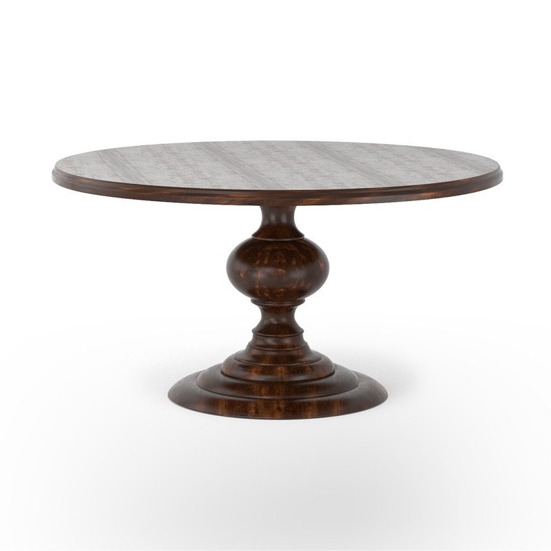 A round of classic farmhouse elegance. Stepped base, turned mango wood pedestal, and round top are wire-brushed and finished in a dark oak stain. The Magnolia Dining Table is strictly stunning.