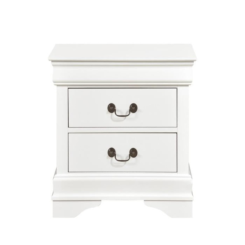 Traditional in design and modest in scale, the elegant Mayville Collection takes its design inspiration from the classic Louis Philippe styling. The Okume veneer of the nightstand is paired with a white finish and is accentuated by antique brass tone drop