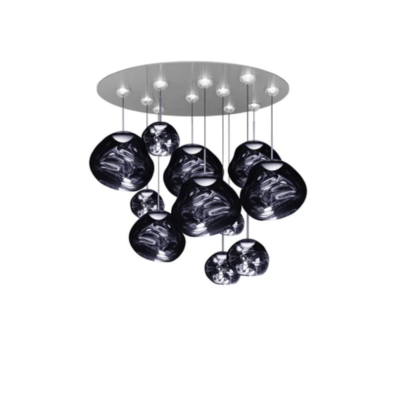 This chandelier features a round canopy and six individual Melt and five Melt Mini suspensions, in a modern finish that creates a stunning blown glass effect. The mirror finish makes it unique even when switched off, according to a highly technological production technique developed in Germany.A lamp suitable for any environment and which will become its undisputed protagonist.This suspension belongs to the new Pendant System collection.
