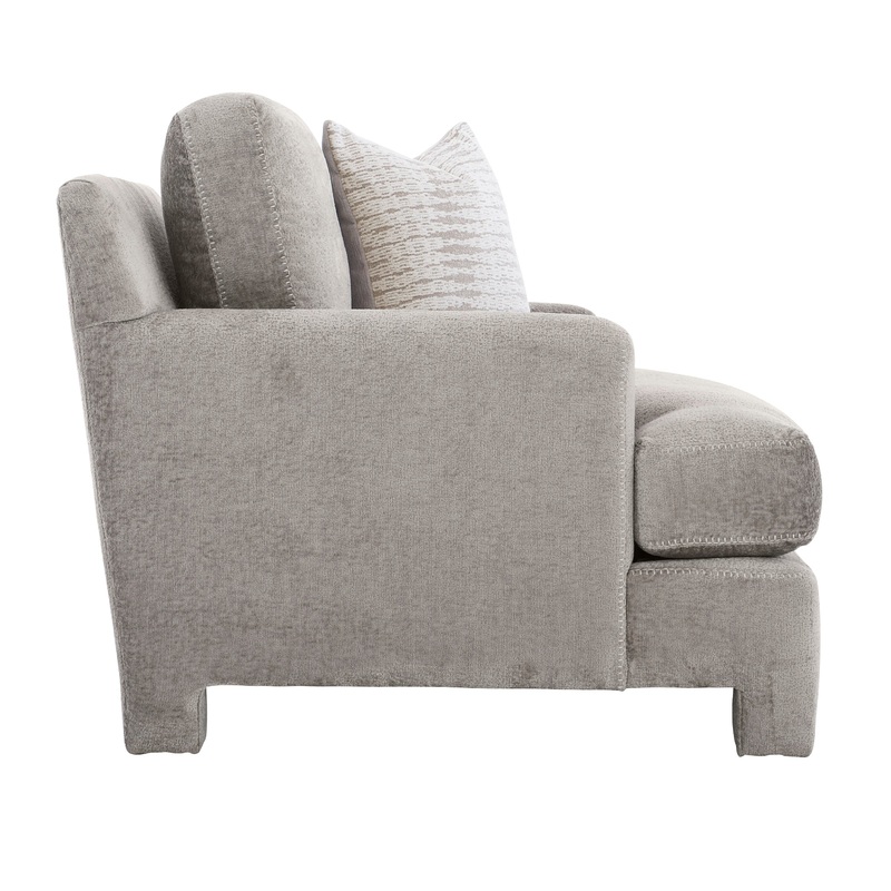 Fully upholstered from top to bottom, the Mily chair brings a soft touch to the luxe living space. The modern design features a low-profile back and recessed track arms. Sumptuous feather down cushioningoffers luxurious comfort, while the combination of natural fabric and relaxed tailoring presents a serene, sophisticated look. Special contrast stitching adds a unique design detail to this welcoming piece.