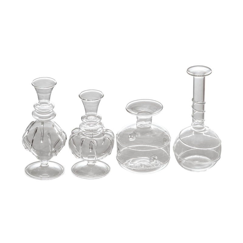 A charming set of four bud vases in four different designs. An interesting way to display a single stem of your favorite flower. Each bud vase is individually boxed. Your next hostess gift is virtually ready to go.