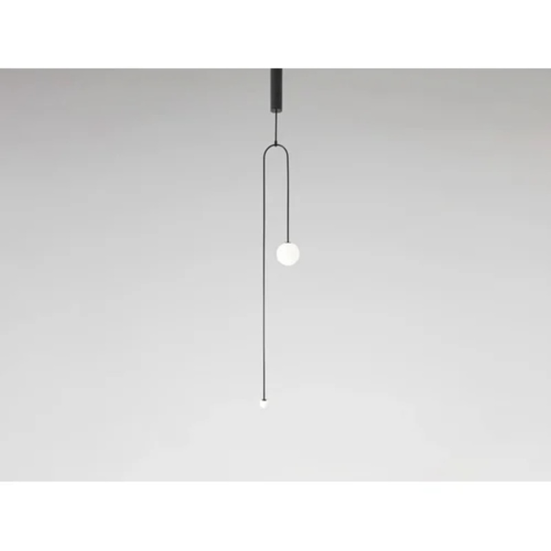 Mobile Chandelier 7 Ceiling LampMobile Chandelier 7 is part of the newest lighting projects presented by Michael Anastassiades. Pendant lamps with minimal design in glossy black brass characterized by thin metal curves that support Opal spheres of differen