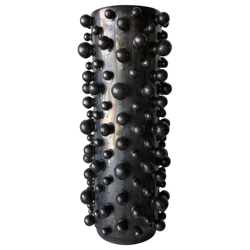 Spheres of varying sizes are playfully bound to each of our cylindrical ceramic vases. In fact, it's a skillful feat to produce each vase in full molecular detail from one mold. Beautiful with flowers, or as standalone sculpture -7.5"Dia. x 13.5"H -Premium