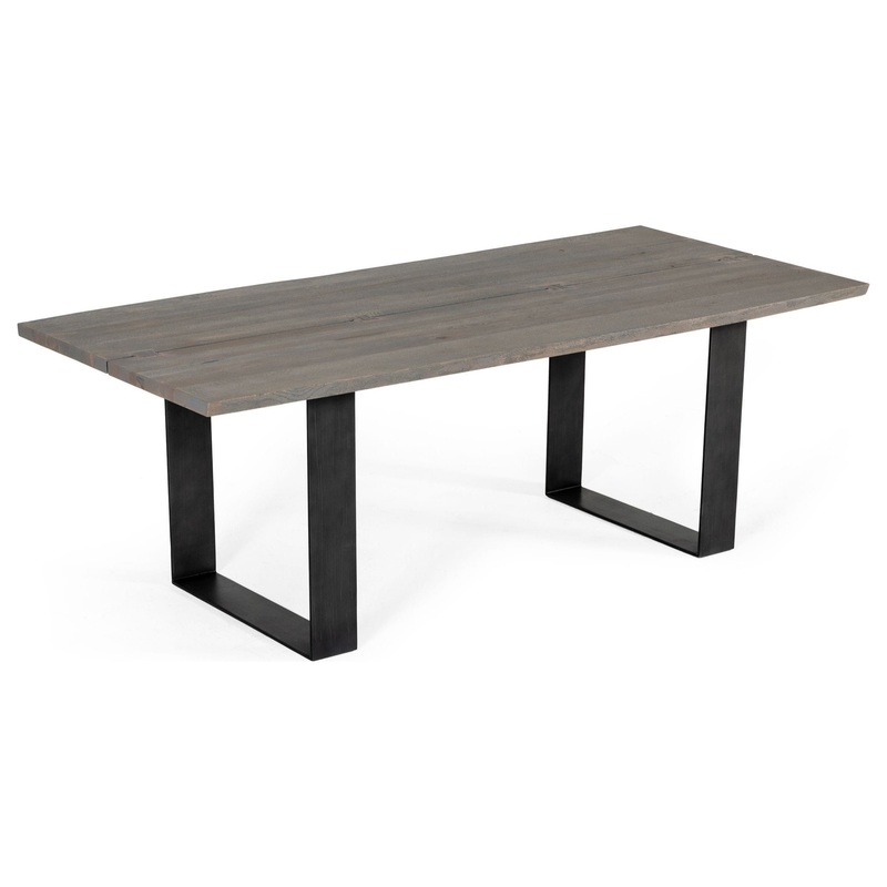 Who says that using natural materials isn’t stylish and beautiful? You can see the imperfections of the gray-washed finished solid oak top and its hourglass-shaped joinery. The natural live end finished edges add a bit of drama to our typical straight-laced world. The flat plate painted metal pedestal legs create a final decorative touch to this unique table.