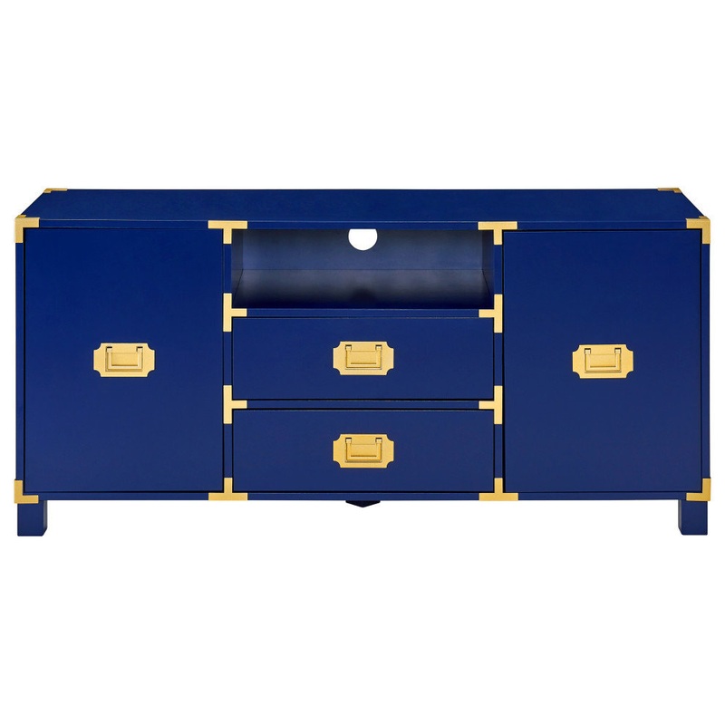 Square off clutter with the easy, classic design of this campaign-inspired media stand. Glam style brass hardware adorns the drawers and corners, contrasting with the sleek navy hue. Two drawers in the center conceal smaller items, while the open shelf nestles any media players you need, supplying easy controller access. The side cabinets feature shelving to keep everything extra organized. Create a stylish media center in any room with this chic storage credenza. Navy finish. Versatile media sideboard. Holds flat screen TV up to 55. 2 drawers and 2 cabinets with 1 adjustable and 1 fixed shelf. Classic, campaign-inspired design. Dust with a soft, dry cloth.