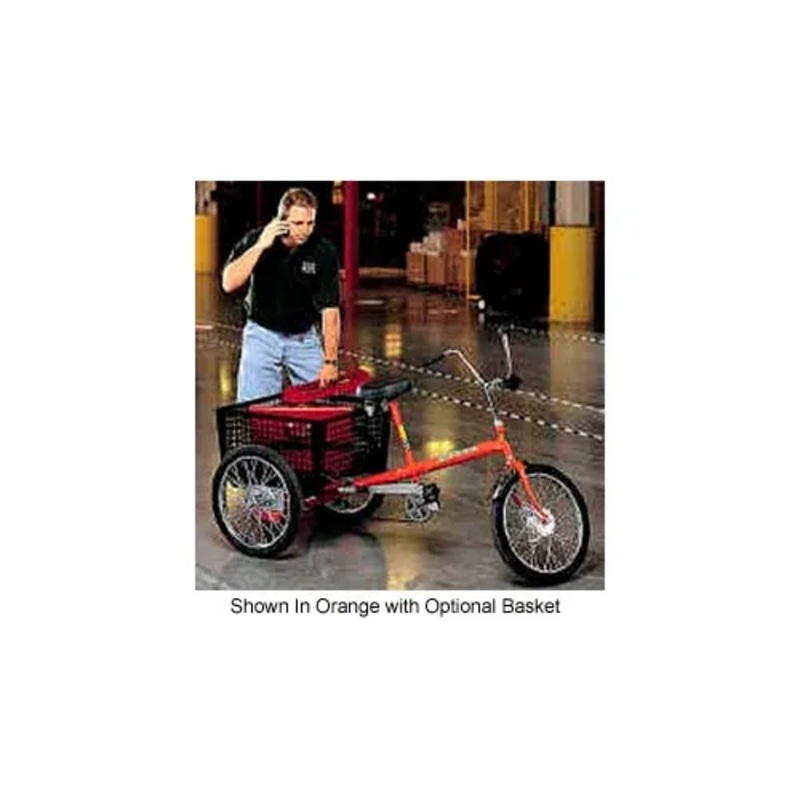 Mover tricycles are reinforced to withstand tough, heavy duty cycle applications with an amazing 500 lb. Capacity. Three-wheel design for stability. Made using a one-piece, welded steel frame. Features extra thick 3/16″ chains and reinforced housing, seat tube and rear axle. Rear axles are 7/8″ machined solid steel linked to coaster brakes to create a durable drive train. Cushioned seat is height adjustable to accommodate personnel of varying heights. Tricycles have a 550 lb. capacity. Features front drum brakes and coaster brakes for high safety. Mover tricycles include a 22-1/2 sq. in. heavy gauge steel rear platform. Platform accepts Optional Baskets or Boxes (sold separately) for convenient, secure cargo space. Note: Optional front and rear baskets must be purchased in same order as tricycles.