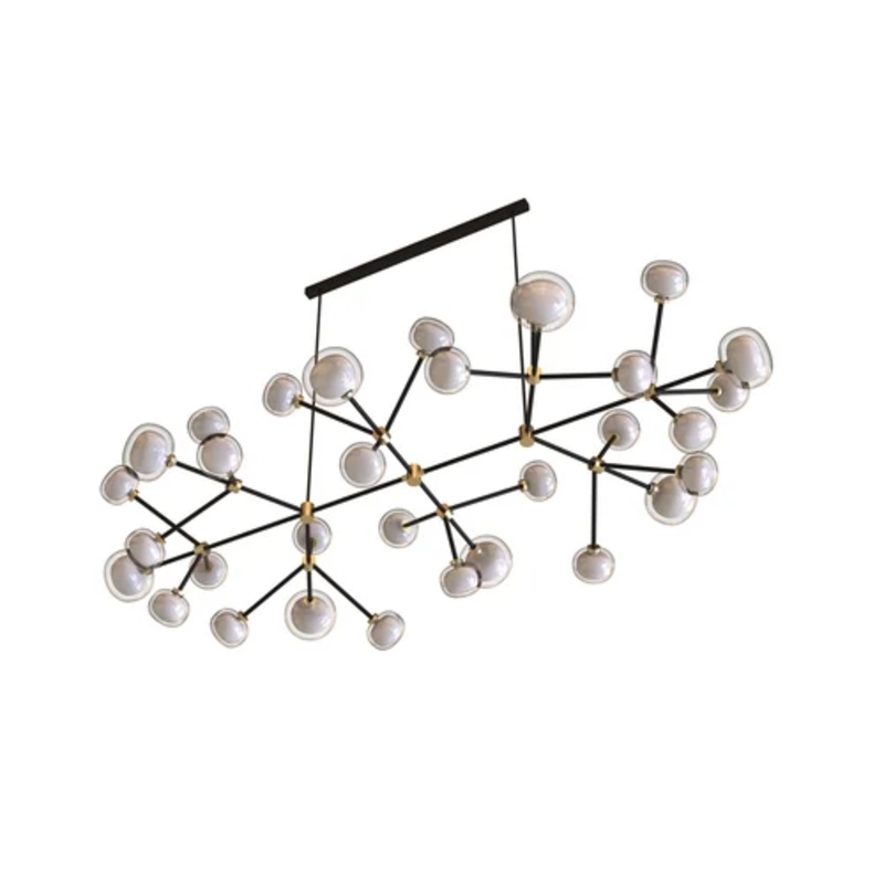 Featuring spherical luminous bodies crafted from double-walled borosilicate glass, this chandelier creates a captivating play of light and transparency. The architectural structure, made from epoxy powder-coated metal, integrates seamlessly with brushed brass details, offering a harmonious blend of materials. The spacious dimensions make this chandelier an ideal statement piece for grand dining areas or sophisticated living rooms, bringing a touch of refined elegance to any interior space. Available in clear glass, its refined design allows it to complement diverse dcor styles while enhancing the ambiance with its soft glow.