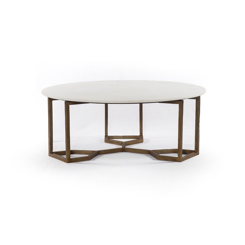 A graceful twist on geometric-inspired design. An aluminum base of raw brass forms pentagons to support a rounded top of polished white marble. An open-air look lends lightness to heavy materials.