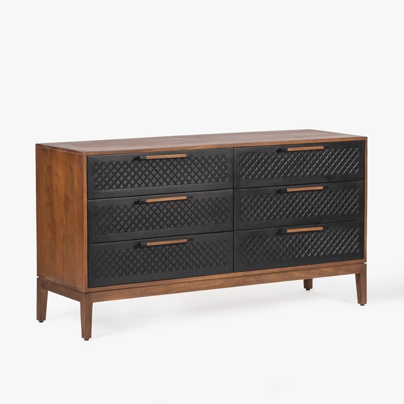 The Naya 6-Drawer Dresser is a sleek blend of modern design and rich materials. With a striking black and walnut finish, this piece features six spacious drawers accented by black metal hardware with wood detailing, offering a sophisticated touch. Perfect for adding both style and storage to any bedroom.