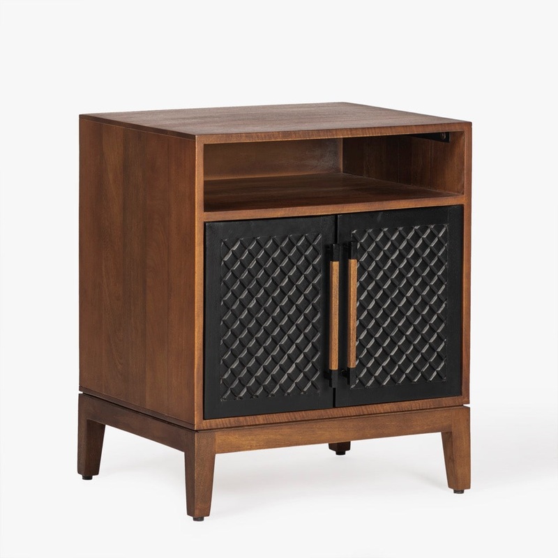 The Naya Nightstand combines sleek black and walnut finishes for a modern look. Its black metal hardware and stylish wood details add an industrial touch, while providing ample storage for your essentials. A perfect blend of function and elegance for any b