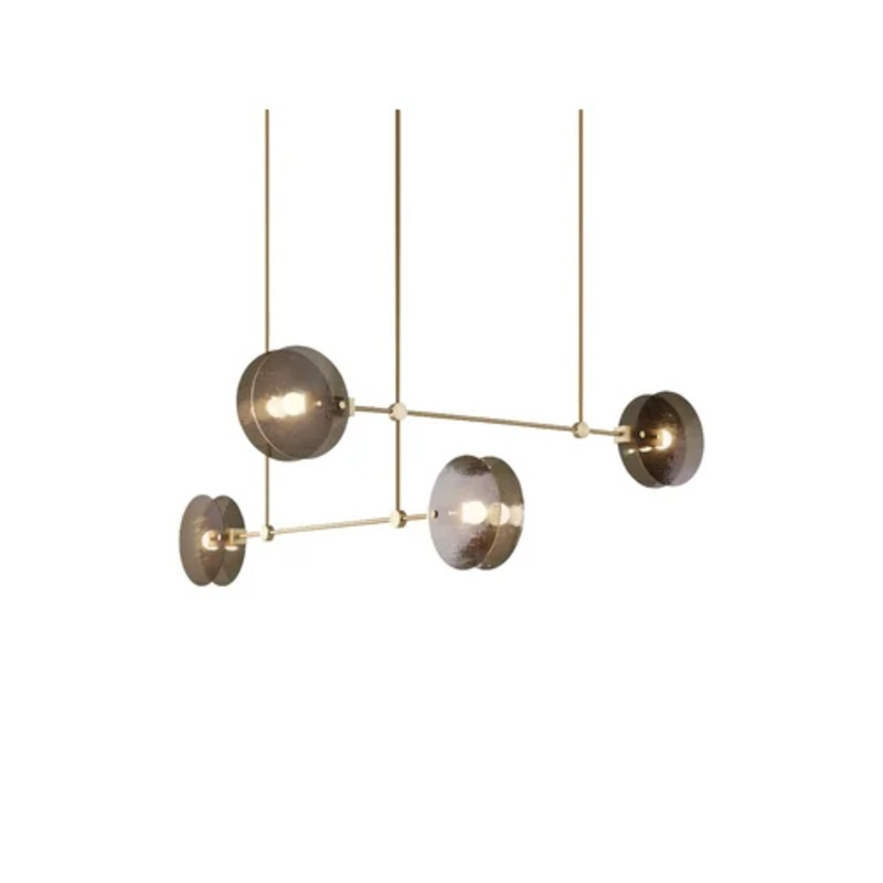 Balancing precision and fluidity, the Nebulae Horizontal 34 features a modular structure where geometric aluminium elements intersect with rippling glass discs. The interplay of solid and translucent materials evokes the layered qualities of nebulae, lending a diffused, ambient illumination. Designed for expansive interiors, it performs elegantly above dining tables, along kitchen islands, or within gallery-like commercial spaces. Its linear configuration offers versatility in layout, while the option of various glass finishes allows for subtle customisation in tone and light diffusion.