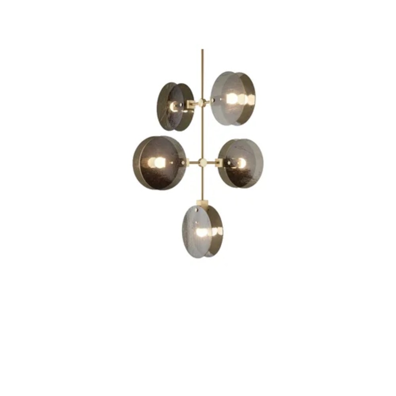 The Nebulae Vertical 15 brings together layered glass discs and finely machined aluminium elements in a structured vertical form. Each tier interacts with light through varying densities of glass, producing subtle shifts in tone and luminosity. Designed for tall interiors, this chandelier lends a sense of rhythm and continuity to spaces such as stairwells, multi-level voids, and double-height rooms. Its vertical alignment emphasizes architectural height, while multiple glass finish options offer the flexibility to tailor its visual presence within different contexts.