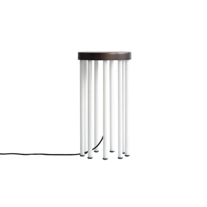 Created as a tribute to the neon design of the 1980s, Neon Table is a hybrid of a side table and a floor lamp. Featuring a bronze-plated table top, it is supported by 9 illuminating legs made of white acrylic tubes with a built-in LED light source. Lightweight, practical and easy to move, it is ideal in a living room, office, or hotel.