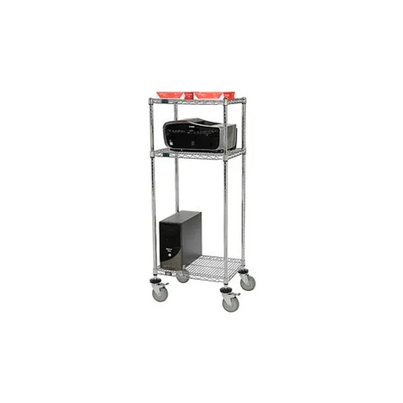 Nexel 3-Shelf Mobile Wire Printer Stand, 24"W x 18"D x 59"H, Chrome Wire construction promotes air circulation and prevents dust build-up. Printer Shelving comes with three shelves. Shelves adjust on 1" increments. Four 5" polyurethane swivel casters (two