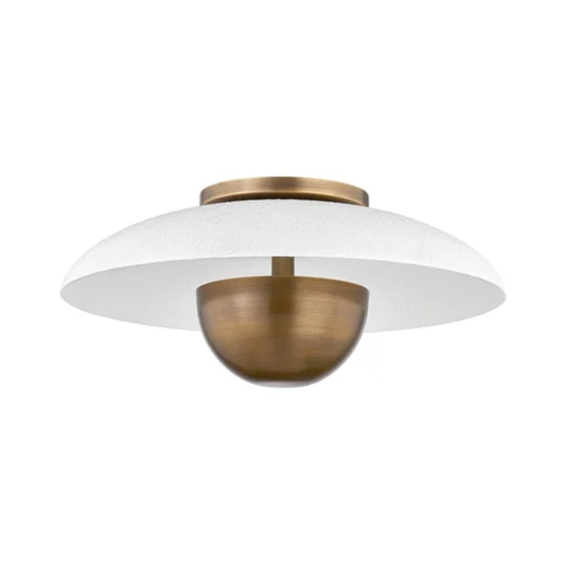 The look is striking from the first glance. A smooth Gesso White dome forms the base, while the inner lining and accents in Patina Brass add warmth and richness. Together, the contrast feels naturallike sunlight hitting stone. The wide, shallow shade directs light downward in a soft, focused pool, making the room feel grounded and calm.