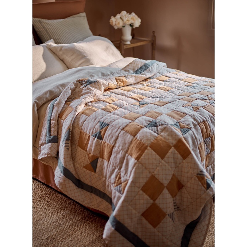 - An enchantingly folksy patchwork quilt in a medley of dusky blues and warm yellows- Sublimely soft, cosily enveloping and crafted from 100% linen- Formed from a patchwork of vintage-inspired ditsy-pattern squares - Handcrafted and steeped in inspiration