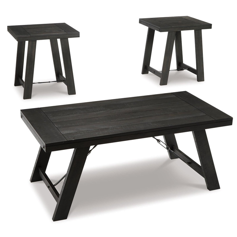Introduce a handsome country feel in your living area with this casual occasional table set. Planked tops with a breadboard layup supported on canted legs give this set a distinctive farmhouse look. The vintage distressed black wash finish combined with the end tables’ leg stretchers and coffee table’s tension bars deliver a sense of industrial antiquity that makes this set look robustwhat a sharp look that transcends time.