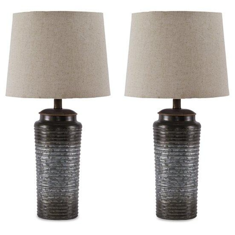 Grace your space with the earthy elegance of this metal table lamp. A top-and-bottom ombre effect on the galvanized metal base is delightfully different. Ribbed texturing adds that much more interest.Made of galvanized metal with fabric hardback shadeOn-of