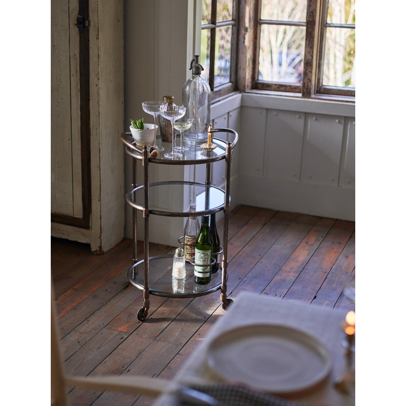 - A timeless Art Deco drinks trolley filled with thoughtful details- Welded in brass with an antique finish- Three tiers of circular glass tops ensure there's a place for everything- Brass bottle supports and sturdy castors that make it easy to move - Fit
