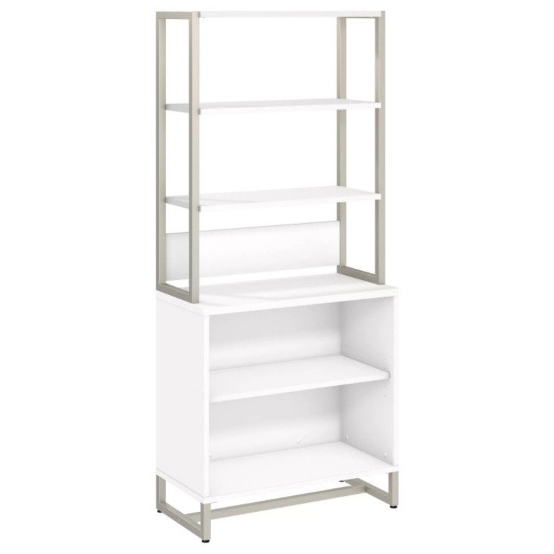 Embrace the unique styling of mid century modern design and enjoy ample storage with the Office by kathy ireland Method Bookcase Cabinet with Hutch. Available in White or Cocoa, the 2 shelf bookcase offers a beautiful and durable titanium finished metal base. Constructed of 100% thermally fused laminate, the modern bookcase fends off scratches and stains to maintain the attractive design. Organize your favorite books and reference materials while using the adjustable shelf to fit items of varying sizes. With durable shelves and a metal frame, the Hutch mounts to the Bookcase Cabinet and offers open storage or display space for books, knickknacks, photos and more. From Office by kathy ireland and Bush Business Furniture, the Method collection comes with a 6 Year Manufacturer’s Warranty and meets ANSI/BIFMA quality test standards. See the full line of commercial office furniture to expand your workplace. Give your office a uniquely modern charm with Method. American made with U.S. and imported parts.