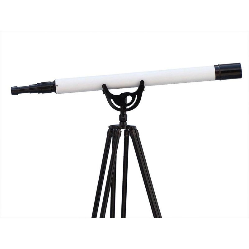 The Floor Standing Oil-Rubbed Bronzed/White Leather Anchormaster Telescope 65'', refractor telescope mounted on a wooden black tripod. This telescope is a fully functioning nautical masterpiece that adds class and sophistication to any room its in. This is
