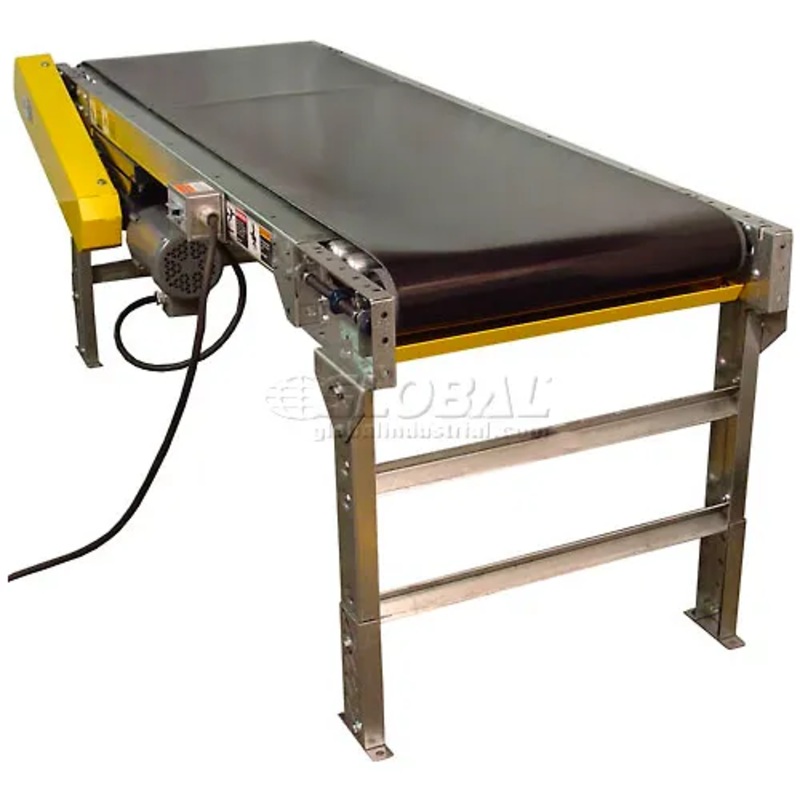 A versatile means of handling a variety of products throughout your facility. Ideal for use in assembly, sorting and inspection. 3-1/2″D x 12 gauge galvanized steel slider bed has black friction surface PVC belt. Includes permanent adjustable leg supports that adjust from 34″ to 38″ H for added convenience. Standard 60 FPM non-reversing belt speed. Totally enclosed 1/2 HP, 115/230V, 60 Hz single phase motor. Includes 8 ft. power cord and on/off switch for 115V use. Quality features include: crowned and fully lagged 4″ drive and tail pulleys with 1-3/16″ dia. shafts, 2-1/2″ dia. snub roller and 1.9″ dia. return rollers, and pre-lubricated, self-aligning ball bearings. Reversible conveyors and replacement parts are available; call for information.