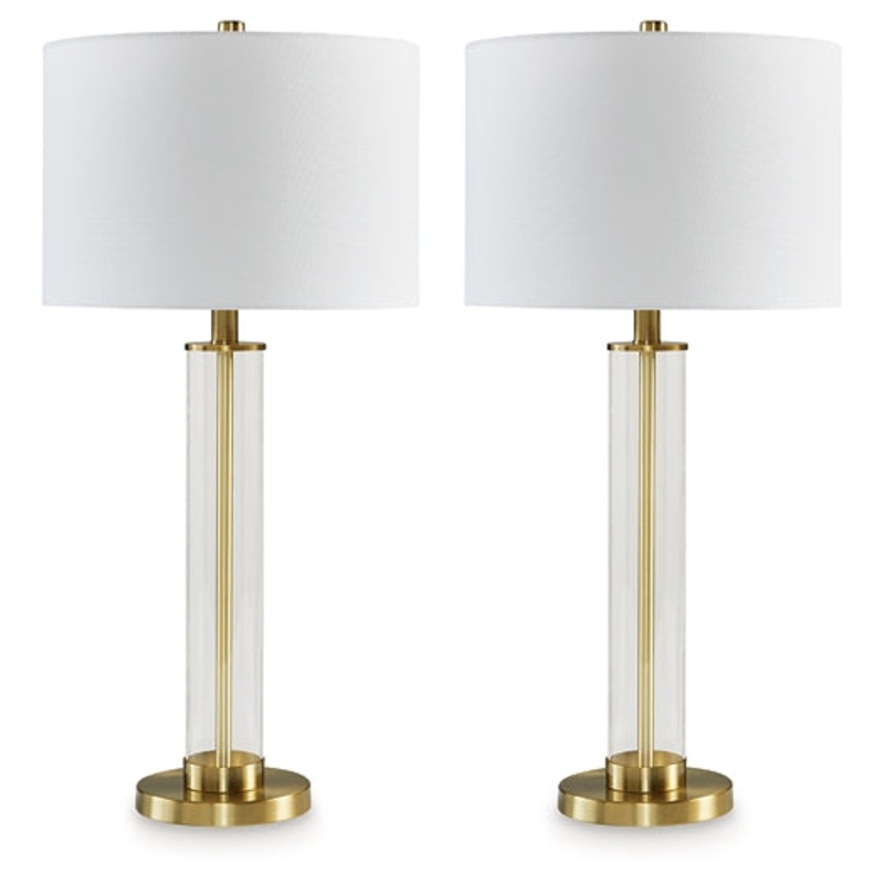 The body of this elegant table lamp has a contemporary flair, with a transparent glass cylinder that reveals a brass-tone rod inside. It's a minimal design made for maximal illumination.Made of glass and metal with drum hardback fabric shadeBrass-tone fini