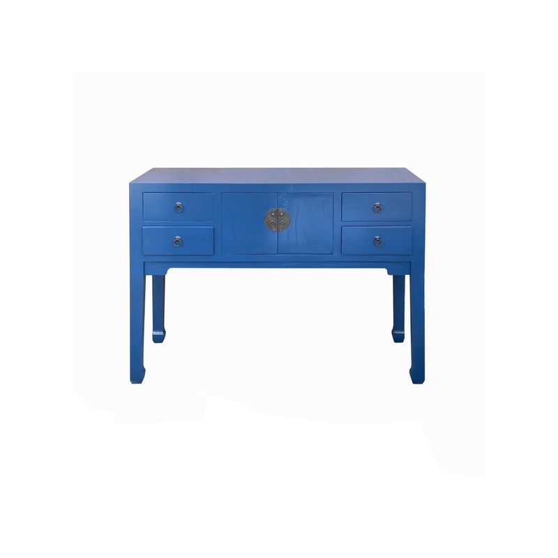 This is a simple oriental bright blue lacquer round moon face hardware console side table with a straight-leg design. Drawers are decorated with an Asian-style handles. -Dimensions: w43.25"x d15"x h33.5" -Origin: China -Material: Wood -Condition: hand-made