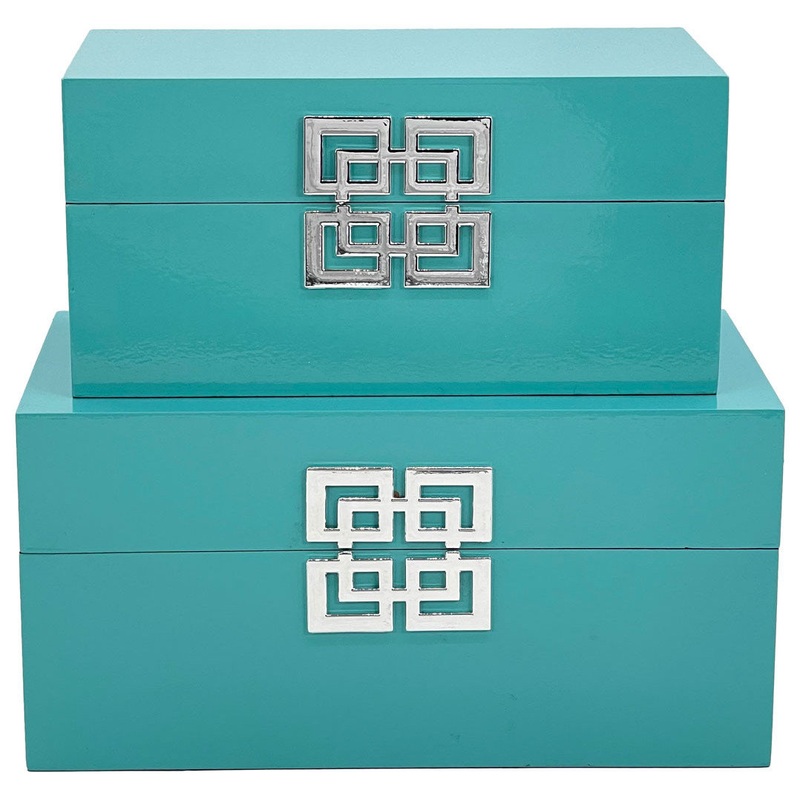 This set consists of two jewelry boxes and it is the perfect addition to your home. It is hand detailed with a robins egg blue luster finish made out of poplar with a fabric lining. This piece is beautiful together or separately wherever you see fit. -Spot