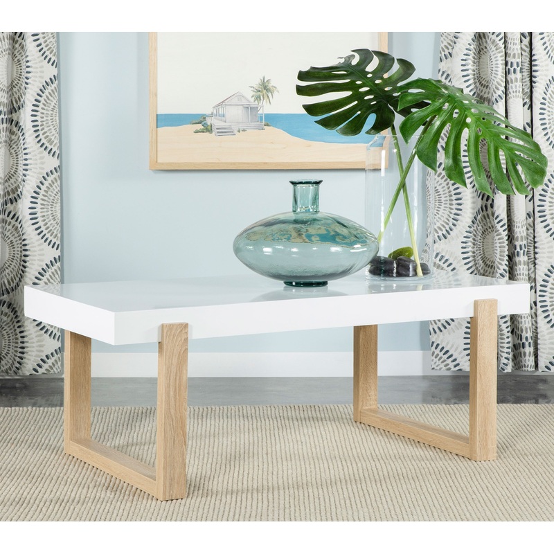 A spacious white high-gloss tabletop defines the modern appeal of this rectangular coffee table. The thick square-edged surface rests within a sled-style base supported by dual U-shaped legs. Crafted from engineered wood, its bright white hues contrast beautifully with the light natural finish of the base, highlighting its variegated wood grain pattern. Perfect for casual or contemporary spaces, this cocktail table adds charm and function, ideal for magazines, beverages, or decor in any living room.