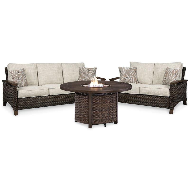 Pretty enough for trendy interiors, yet durable enough to weather the elements, this outdoor package rises to the challenge beautifully. Made of handwoven weather-resistant materials, the sofa, loveseat and fire pit table merge high style with low maintenance. Rest assured, though the exposed armrests and feet look remarkably like wood, their sturdy aluminum construction is perfectly suited for alfresco living. Plush seat cushions and throw pillows wrapped in high-performing Nuvella fabric aim to please. The fire pits steel burner conveniently ignites at the push of a button. An included burner cover transforms the fire pit into a coffee table, making it perfect for a variety of occasions.