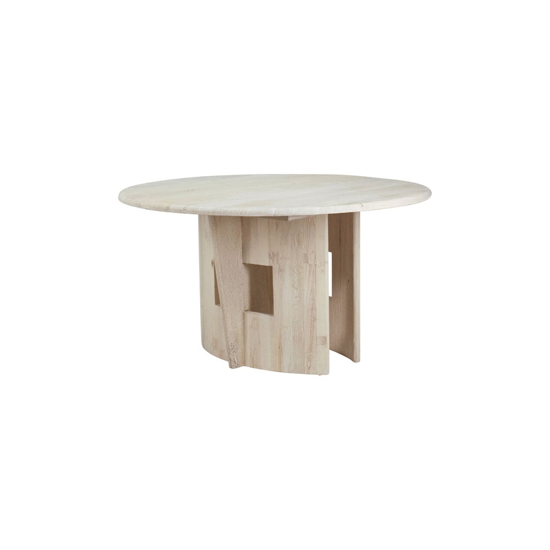 Made from reclaimed elm wood, the Payton Dining Table features a soft, beveled edge top that is finished in a natural whitewash tone that highlights the wood's grain patterns and knots. Completed by a unique and fun geometric designed pedestal base that pr
