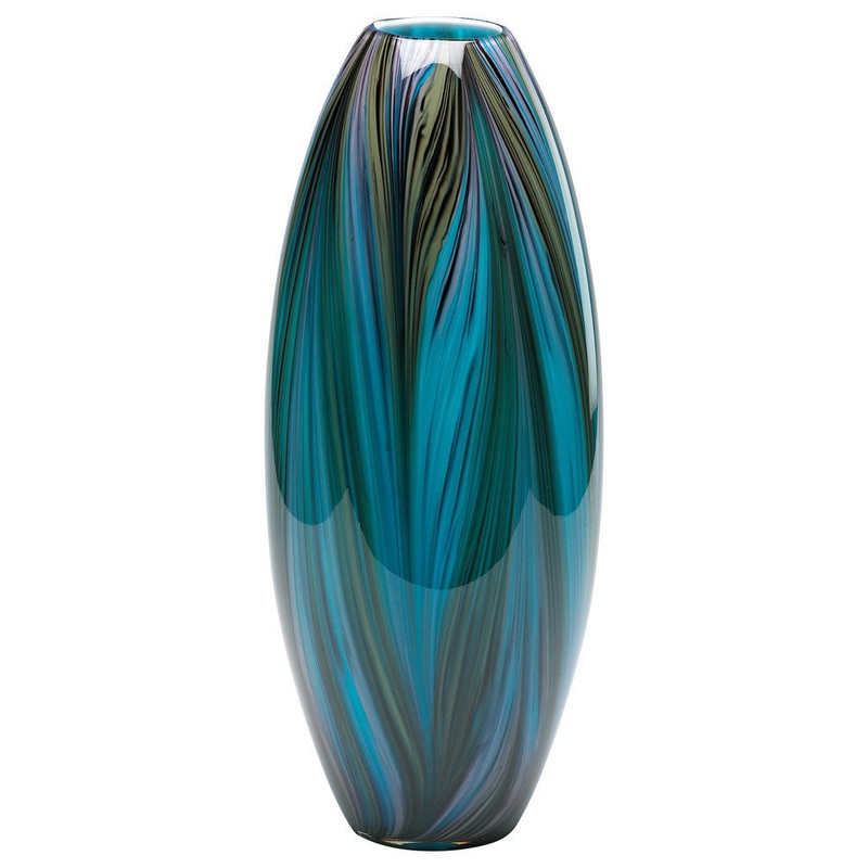 Decorate a mantel or console with the chic Peacock Feather Vase. Made from bright blue swirled glass with light brown and purple accents, this vase is elegant and vibrant. Fill it with a simple floral arrangement or display it on its own. Model # (MPN)2920